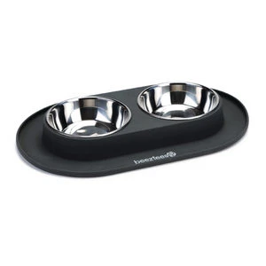 Beeztees Siliconen RVS Dinerset Antraciet Makkelijk afwasbare dinerset. De RVS bakjes zijn uitneembaar en vaatwasbestendig. Door de siliconen onderzijde schuift de dinerset niet over de vloer. Afmeting dinerset: 40x24cm Inhoud per bakje: 500ml