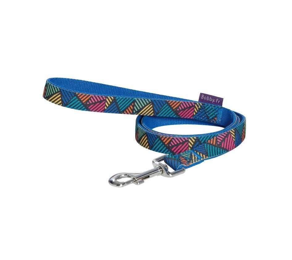 Hondenriem Color Een vrolijke zomerse hondenriem van sterk nylon, in het blauw met diverse kleuren. De riem kan op 30 graden in de wasmachine worden gereinigd. Leverbaar in de volgende maten: Maat Lengte Breedte XS 100 cm 16 mm S 100 cm 20 mm