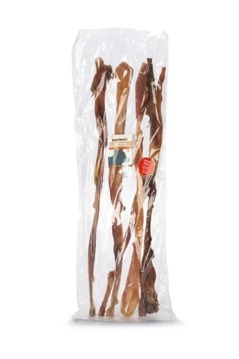 Zak à 5 stuks runderkophuid. Gedroogde runderkophuid moet de hond langzaam zachtkauwen. Per stuk 80cm