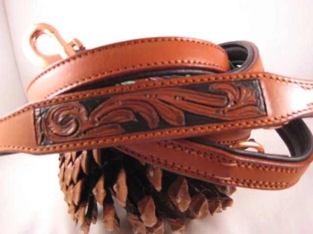 Hondenriem Savanne Cognac Deze hondenriem is prachtig met de hand gemaakt van zadelleer en gevoerd met zacht kalfsleer. De riem kan prima als trainingslijn worden gebruikt want de riem is voorzien twee musketon haken. Ook kan deze hondenriem 3-voudig verstelbaar. De bovenzijde van deze riem is uitgevoerd in een cognac kleur met fraaie decoraties. De binnenzijde is gevoerd met kalfsleer in zwart. De musketonhaken en de ringen zijn prachtig uitgevoerd in een koperkleur. De riem is 18 mm breed en 200 cm lang.
