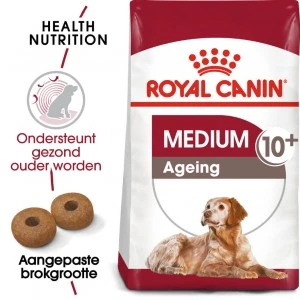 Royal Canin Medium Ageing 10+ hondenvoer is een compleet droogvoer voor middelgrote oudere honden vanaf 10 jaar met een volwassen gewicht tussen 11 en 25 kg. De kenmerken van Royal Canin Medium Ageing 10+ zijn: * Helpt uw hond gezond ouder worden * Ondersteunt botten & gewrichten * Draagt bij aan een gezonde huid- & vachtconditie